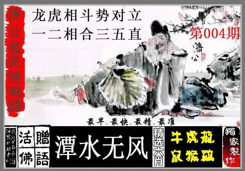 004期闲情暗语:鱼龙混杂 解释:意思是指群体中混杂着品行能力迥异的个体 七肖:虎兔牛鼠马龙蛇 五肖:虎兔牛鼠马 三肖:虎兔牛 一肖:虎 |